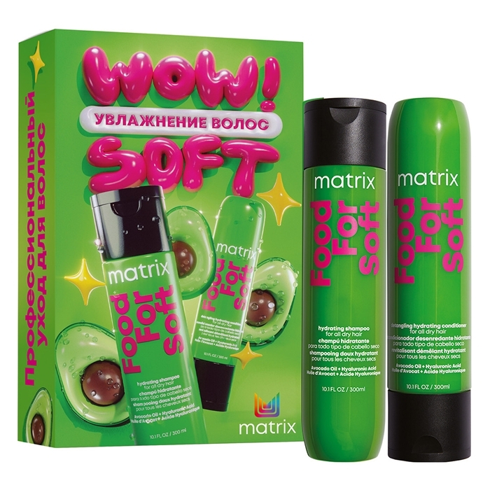 Встречай новую коллекцию подарочных наборов профессиональных уходов от Matrix для увлажнения и мягкости волос! Профессиональный шампунь Food For Soft (300 мл): — содержит масло авокадо и гиалуроновую кислоту — бережно очищает волосы — питает и увлажняет волосы изнутри Увлажняющий кондиционер Food For Soft (300 мл): — обогащён маслом авокадо и гиалуроновой кислотой — мгновенно увлажняет пересушенные волосы — запечатывает влагу внутри волоса — делает кутикулу гладкой — обеспечивает мягкость и лёгкое расчёсывание — работает без утяжеления Ключевые преимущества: — в 7 раз больше увлажнения — подходит для всех видов сухих волос — подходит для ежедневного применения Аромат раскрывается нотами: — сладкой ириски — жасмина — фрезии — ванили