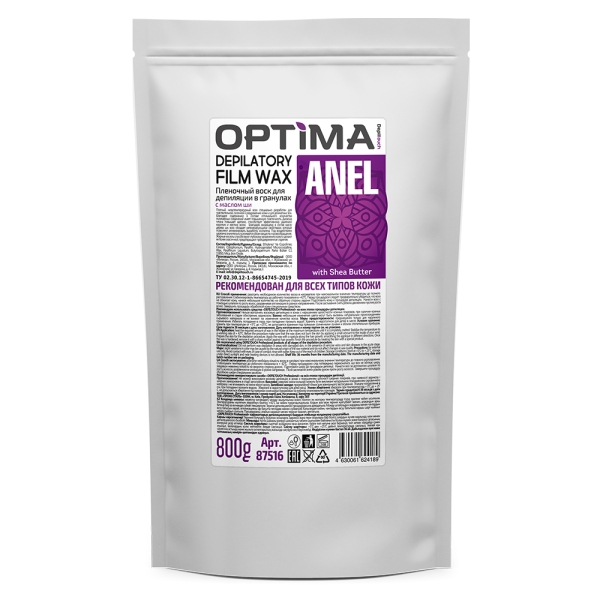 Пленочные воски в гранулах серии OPTIMA - это российские воски нового поколения для депиляции в различных техниках. Пленочные воски наносятся тонким слоем, четко повторяют контуры тела и удаляются руками без использования дополнительных материалов. Обладают повышенной пластичностью и обеспечивают отличный результат. Невысокая температура плавления гранулированных восков 40 - 45С уменьшает вероятность ожогов, при нанесении производит эффект распаривания, облегчая выход волоса. Диоксид титана в составе воска дарит ему дополнительную пластичность, снижает температуру плавления, повышает адгезию, способствует эффективному удалению коротких и жестких волос. Пленочный воск ANEL содержит масло дерева ши, которое обладает регенерирующими свойствами, позволяет активизировать выработку коллагена. Жирные кислоты масла способствуют глубокому увлажнению кожи и делают ее более эластичной, предотвращают преждевременное старение. Под воздействием входящего в состав воска церезина значительно усиливается обмен веществ и кровообращение.