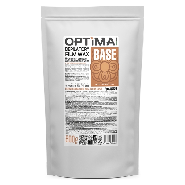Пленочные воски в гранулах серии OPTIMA - это российские воски нового поколения для депиляции в различных техниках. Пленочные воски наносятся тонким слоем, четко повторяют контуры тела и удаляются руками без использования дополнительных материалов. Обладают повышенной пластичностью и обеспечивают отличный результат. Невысокая температура плавления гранулированных восков 40 - 45С уменьшает вероятность ожогов, при нанесении производит эффект распаривания, облегчая выход волоса. Диоксид титана в составе воска дарит ему дополнительную пластичность, снижает температуру плавления, повышает адгезию, способствует эффективному удалению коротких и жестких волос. Пленочный воск BASE, прозрачный по текстуре, без диоксида титана. Подходит для работы по бразильской системе депиляции, имеет длительное застывание 10 - 12 секунд, что позволяет распределить воск на большие поверхности. Подходит для тонкого, пушкового волоса.