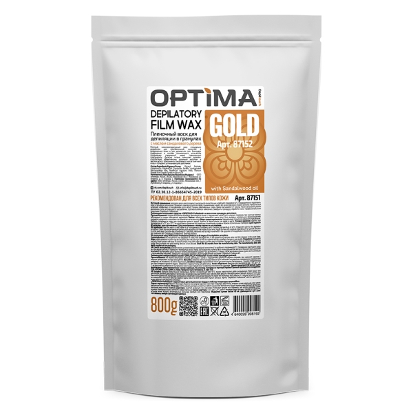 Пленочные воски в гранулах серии OPTIMA - это российские воски нового поколения для депиляции в различных техниках. Пленочные воски наносятся тонким слоем, четко повторяют контуры тела и удаляются руками без использования дополнительных материалов. Обладают повышенной пластичностью и обеспечивают отличный результат. Невысокая температура плавления гранулированных восков 40 - 45С уменьшает вероятность ожогов, при нанесении производит эффект распаривания, облегчая выход волоса. Диоксид титана в составе воска дарит ему дополнительную пластичность, снижает температуру плавления, повышает адгезию, способствует эффективному удалению коротких и жестких волос. Пленочный воск GOLD, обогащенный ценным маслом сандалового дерева, имеет короткое время застывания применяется в том числе на чувствительных участках кожи, идеален при гипергидрозе.