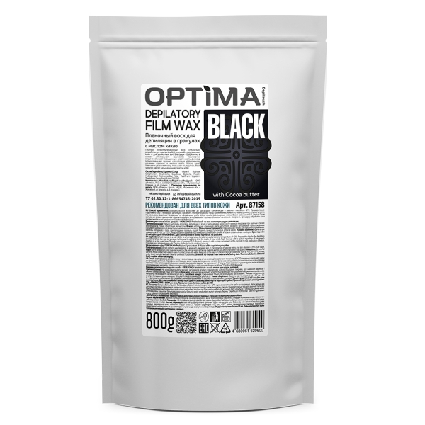 Пленочные воски в гранулах серии OPTIMA - это российские воски нового поколения для депиляции в различных техниках. Пленочные воски наносятся тонким слоем, четко повторяют контуры тела и удаляются руками без использования дополнительных материалов. Обладают повышенной пластичностью и обеспечивают отличный результат. Невысокая температура плавления гранулированных восков 40 - 45С уменьшает вероятность ожогов, при нанесении производит эффект распаривания, облегчая выход волоса. Диоксид титана в составе воска дарит ему дополнительную пластичность, снижает температуру плавления, повышает адгезию, способствует эффективному удалению коротких и жестких волос. Пленочный воск BLACK - самый плотный воск из серии. С большим содержанием диоксида титана, способствует эффективному удалению забритого, короткого волоса. Подходит для работы с мужчинами. Масло какао в составе придает коже эластичность, увлажняет, способствует регенерации. Антиоксиданты и минералы, содержащиеся в масле, помогают бороться с пигментными пятнами, выравнивают тон кожи. Подходит для чувствительной кожи.