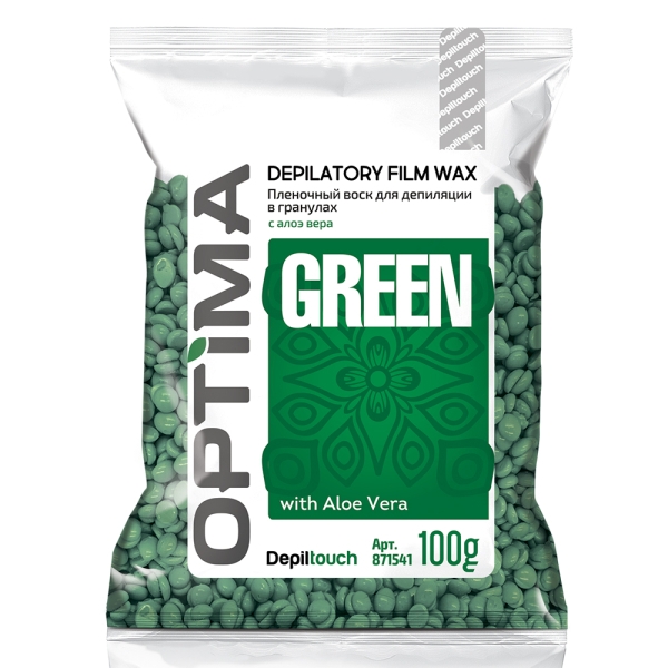 Пленочные воски в гранулах серии OPTIMA - это российские воски нового поколения для депиляции в различных техниках. Пленочные воски наносятся тонким слоем, четко повторяют контуры тела и удаляются руками без использования дополнительных материалов. Обладают повышенной пластичностью и обеспечивают отличный результат. Невысокая температура плавления гранулированных восков 40 - 45С уменьшает вероятность ожогов, при нанесении производит эффект распаривания, облегчая выход волоса. Диоксид титана в составе воска дарит ему дополнительную пластичность, снижает температуру плавления, повышает адгезию, способствует эффективному удалению коротких и жестких волос. Пленочный воск GREEN содержит масло алоэ, которое увлажняет кожу, минимизирует раздражение. В масле алоэ 20 аминокислот, витамины С, А (бета-каротин), Е (альфа-токоферол), В1, В2 и В6 (холин и фолиевая кислота) и полисахариды - углеводные молекулы, обладающие смягчающими свойствами. Воск подходит для работы с чувствительной кожей, на деликатных зонах, включая ювелирные техники лица.