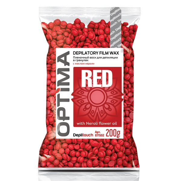 Пленочные воски в гранулах серии OPTIMA - это российские воски нового поколения для депиляции в различных техниках. Пленочные воски наносятся тонким слоем, четко повторяют контуры тела и удаляются руками без использования дополнительных материалов. Обладают повышенной пластичностью и обеспечивают отличный результат. Невысокая температура плавления гранулированных восков 40 - 45С уменьшает вероятность ожогов, при нанесении производит эффект распаривания, облегчая выход волоса. Диоксид титана в составе воска дарит ему дополнительную пластичность, снижает температуру плавления, повышает адгезию, способствует эффективному удалению коротких и жестких волос. Пленочный воск RED, полупрозрачный по текстуре, с эфирным маслом нероли, без диоксида титана. Подходит для работы по бразильской системе депиляции, имеет длительное застывание 5 - 10 секунд, что позволяет распределить воск на большие поверхности. Подходит для пушкового волоса и волос средней жесткости.
