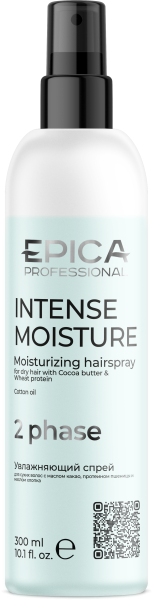 INTENSE MOISTURE Двухфазный увлажняющий спрей для сухих волос с маслом какао и экстрактом зародышей пшеницы. Спрей интенсивно смягчает, питает и удерживает влагу в структуре волоса. Повышает упругость, возвращает естественный блеск, оказывает кондиционирующее действие. Обладает антиоксидантными свойствами. Предназначен для сухих волос, делает волосы мягкими и шелковистыми, улучшает расчёсывание.