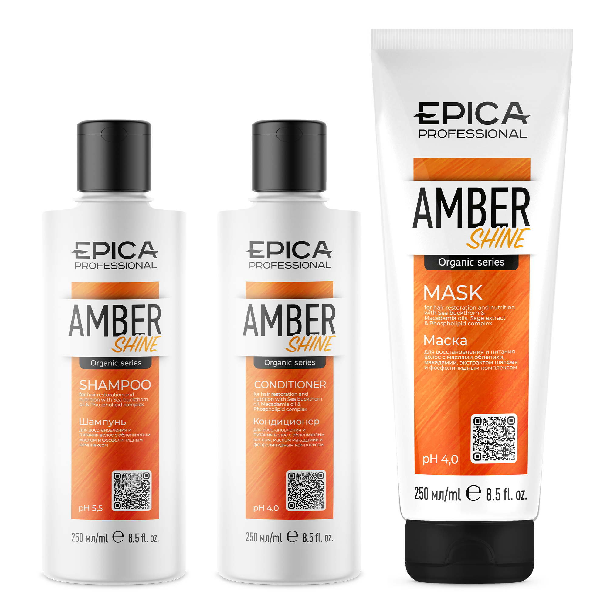 Набор Amber Shine Organic – разработка бренда профессиональной косметики Epica. Средства рекомендованы для ухода за ломкими, тусклыми и ослабленными волосами.
