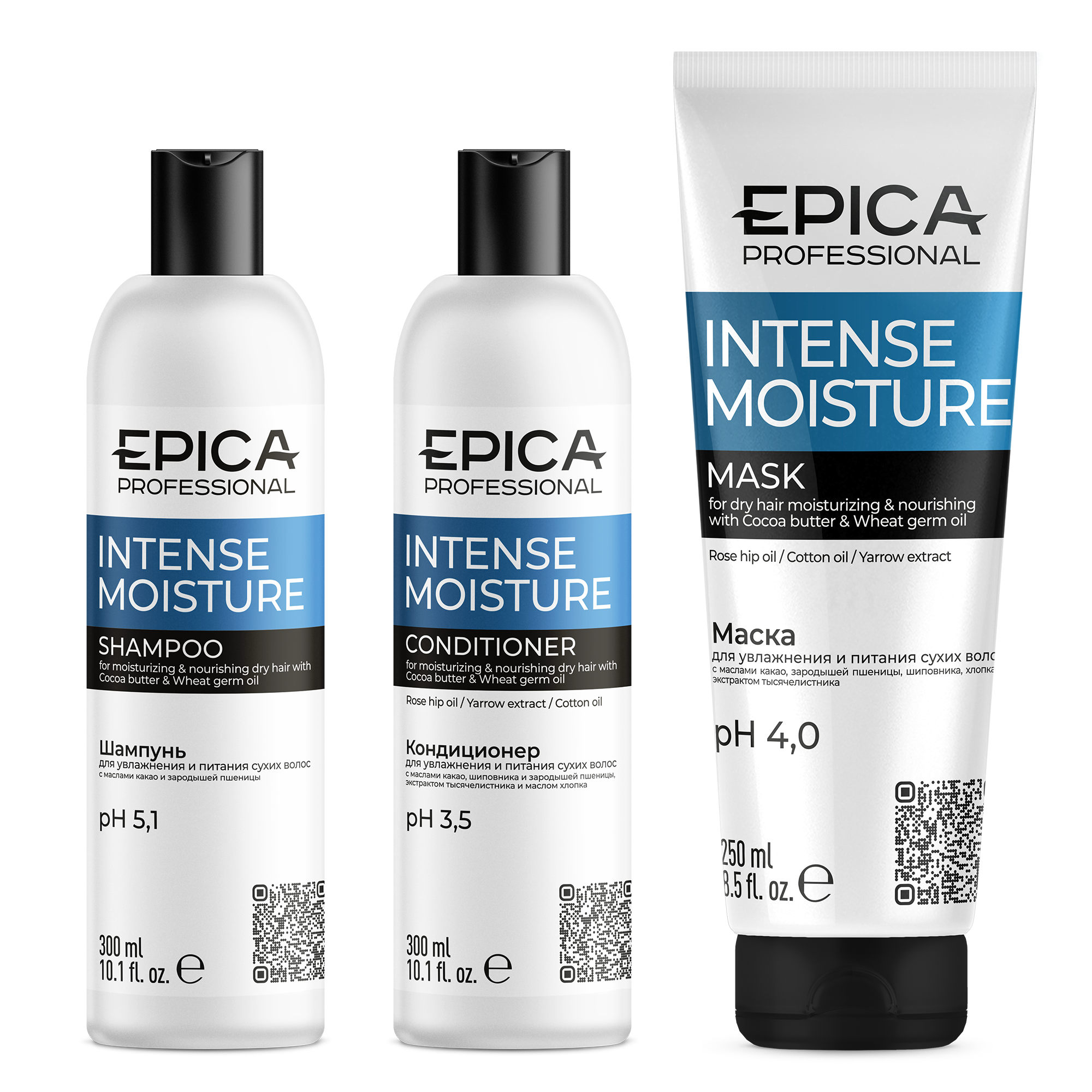 Набор Intense Moisture профессионального бренда Epica Professional включает 3 средства для глубокого увлажнения волос: шампунь и кондиционер объемом 300 мл каждый, а также маску 250 мл.